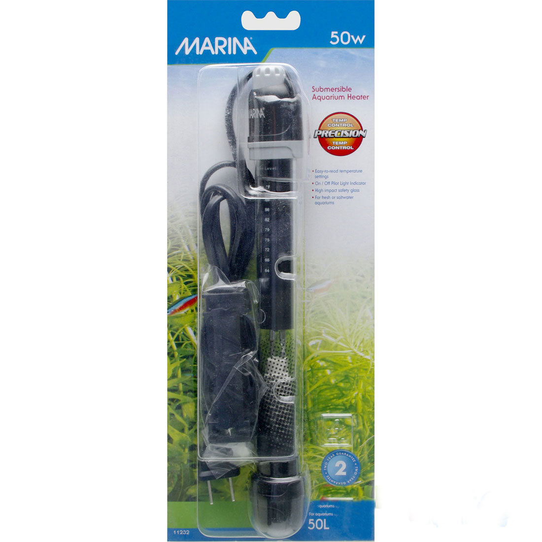 Powerful 50-watt Marina Submersible Aquarium Heater provides reliable heating for fresh or saltwater aquariums up to 38 litres (10 US gal) aquariums. The heater includes many practical features for easy use, safety and convenience, including an easy-to-access temperature set dial, on/off pilot light indicator, and a bumper guard for fish safety. Made of durable high-impact glass, it's built to last under normal aquatic conditions.